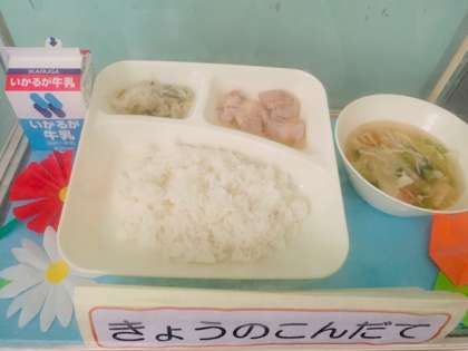 鶏肉のしょうゆマヨネーズ焼き、五目汁、切干だいこんのゆずの香あえ、ごはん、牛乳