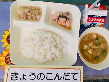 さけのつけ焼き、みそ汁、とうがんの煮もの、ごはん、牛乳