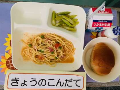 ポークトマトスパゲッティ、グリーンアスパラガスのサラダ、発酵乳、黒糖ロール、牛乳