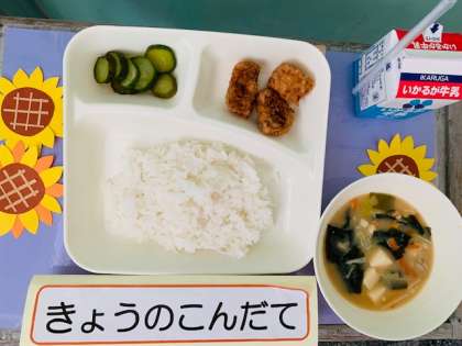 豚肉の香味あげ、みそ汁、きゅうりの甘酢づけ、ごはん、牛乳