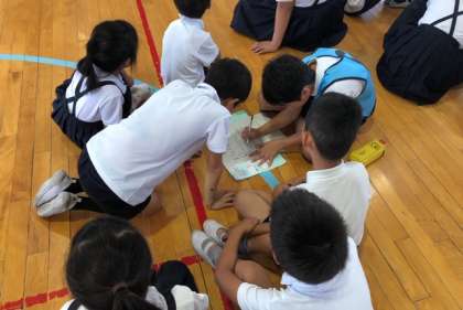 集会委員会がするジェスチャーを見て、たてわり班のみんなで何のジェスチャーをしていたのかを考えました。