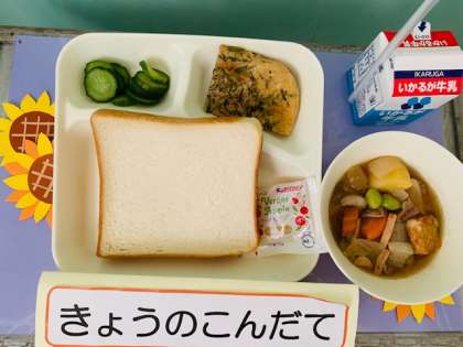 もずく入りヒラヤーチー、豚肉といかの煮もの、あっさりきゅうり、食パン、りんごジャム、牛乳