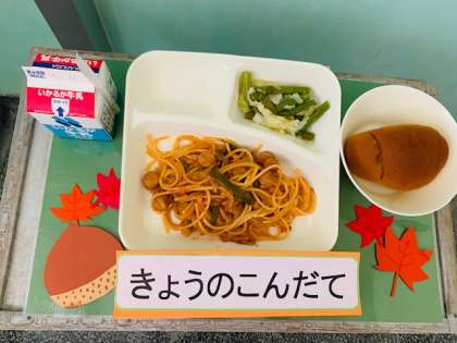イタリアンスパゲッティ、グリーンアスパラガスとキャベツのサラダ、黒糖ロール、牛乳