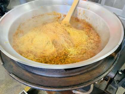 給食室でイタリアンスパゲッティを作っている様子です。炒めた具とゆでたスパゲッティを合わせています。1釜で約250人なので、釜を2つ使って作っています。