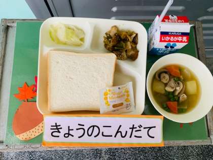 豚肉のカレー風味焼き、スープ煮、サワーキャベツ、食パン、マーマレード、牛乳