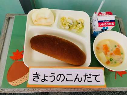 コーンクリームシチュー[米粉]、はくさいのピクルス、りんご、黒糖パン、牛乳