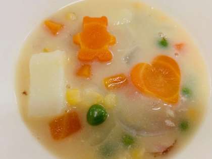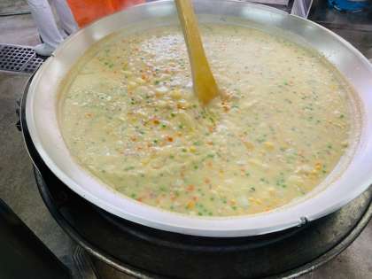 給食室でコーンクリームシチュー[米粉]を作っている様子です。小麦アレルギーの児童も食べることができるよう、ホワイトルウではなく上新粉でとろみをつけています。