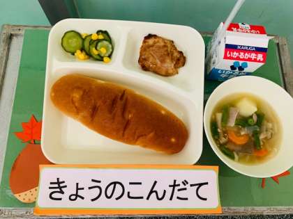 本日の給食 10/4 公開日 2019/10/04 更新日 2019/10/04 お知らせ 鶏肉のみそマリネ焼き[ノンエッグドレッシング]、スープ煮、きゅうりとコーンのサラダ、おさつパン、牛乳 いいね(0)