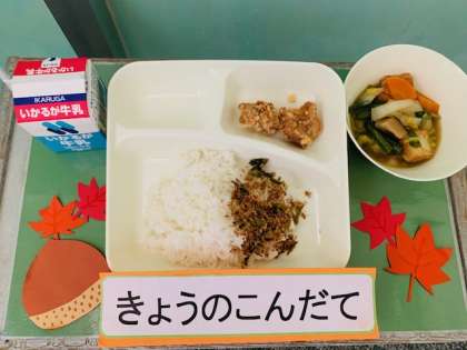 鶏肉のたつたあげ、あつあげと野菜の煮もの、おかかなっ葉、ごはん、牛乳