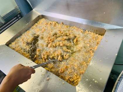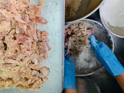 給食室で鶏肉のたつたあげを作っている様子です。衣をつけて、油で揚げています。
