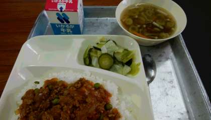 タコライス もずくと白ねぎのスープ キャベツときゅうりのサラダ ごはん 牛乳
