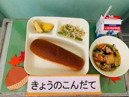 豚肉といかの中華煮、焼きさつまいもの甘みつかけ、もやしとピーマンのいためもの、黒糖パン、牛乳