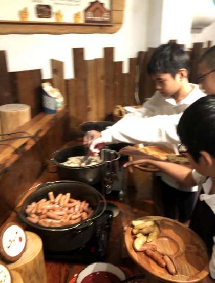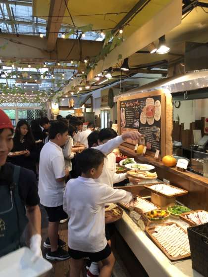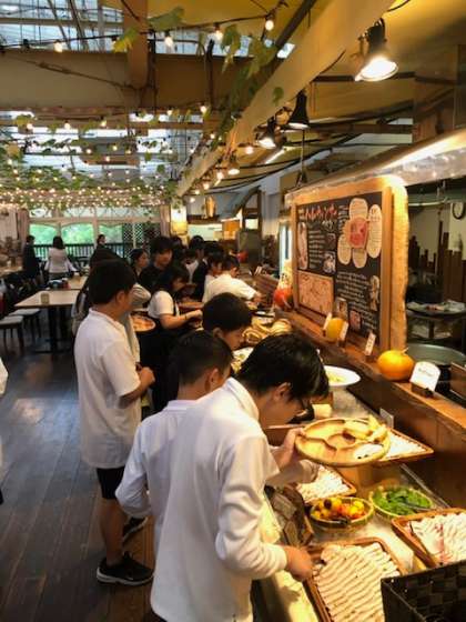 どの料理を食べようか友だちと楽しそうに話しながら盛り付けています。