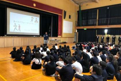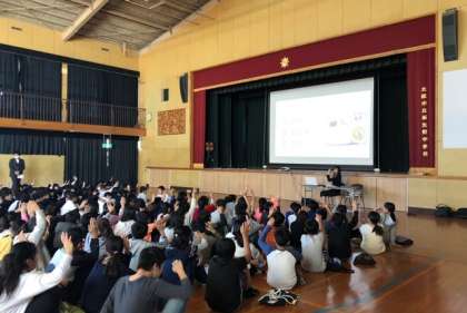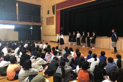 小中かけはし事業で、新生野中学校に行きました。朝ごはんの大切さに着いて学んだあと、中学校の説明を聞いたりクラブ見学をしたりしました。