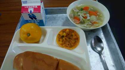 豚肉とキャベツのスープ煮 変わりピザ みかん パン 牛乳