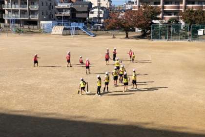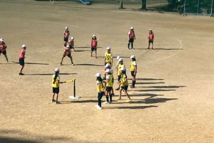 4年生の体育では、ティーボールをしています。