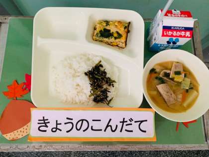 千草焼き、みそ汁、ごまひじき、ごはん、牛乳