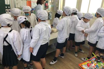 給食の時間には、みんなで協力して配膳しています。