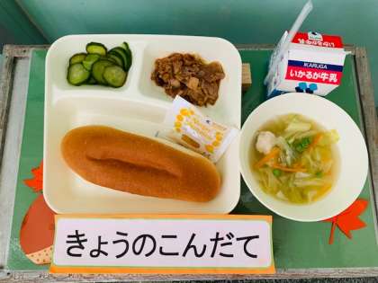 豚肉のデミグラスソース、スープ、きゅうりのサラダ、パン、マーマレード、牛乳