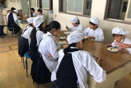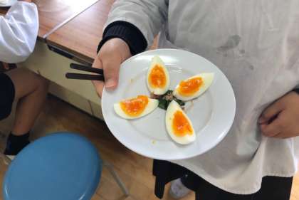 5年生の家庭科では、卵や野菜をゆでて調理実習をしました。みんなでおいしく食べました。
