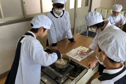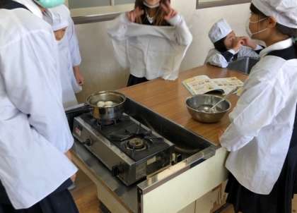 5年生の調理実習のようすです。ゆで卵の火加減を調節し、卵の黄身が真ん中になるようにコロコロと菜箸でころがしながらゆでています。