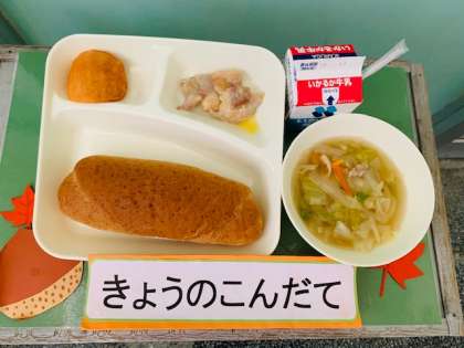 鶏肉のガーリックマヨネーズ焼き、スープ、かき(富有柿)、ライ麦パン、牛乳