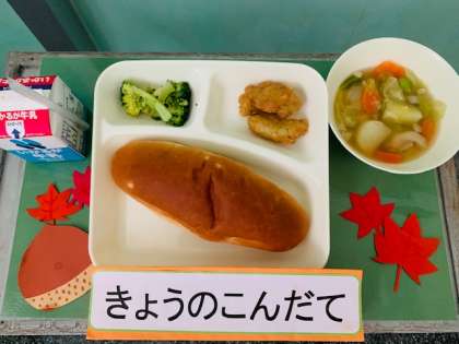 白身魚のフリッター、スープ煮、ブロッコリーのサラダ、おさつパン、牛乳