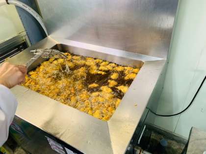 給食室で白身魚のフリッターを作っている様子です。たらの身が使われています。