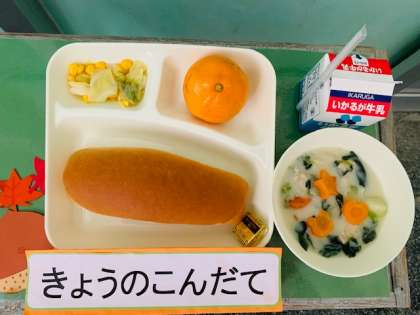 ほたて貝のクリームシチュー、キャベツとコーンのサラダ、みかん、コッペパン、バター、牛乳