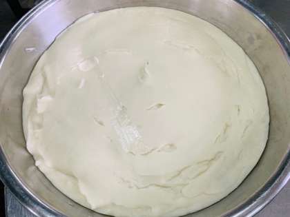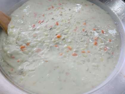 給食室でほたて貝のクリームシチューを作っている様子です。給食ではホワイトルウから手作りしています。今日はラッキーにんじんが入っています。
