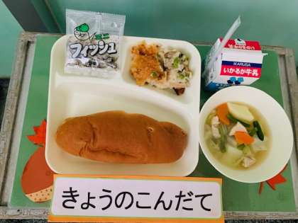 鶏肉とじゃがいものスープ煮、きのこのドリア、ミニフィッシュ、レーズンパン、牛乳