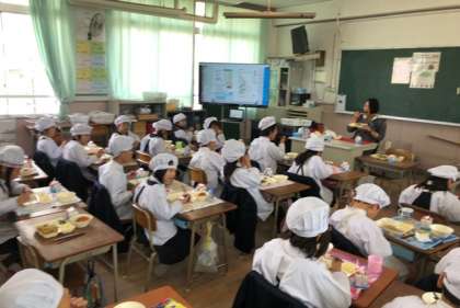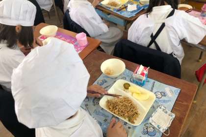 給食のようすです。おいしい給食をみんなで楽しく食べています。