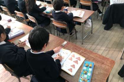 1年生の算数の授業では、計算ピラミッドにチャレンジしました。たし算とひき算を活用して問題を解き進めました。