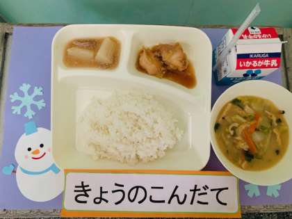 鶏肉の甘辛焼き、みそ汁、だいこんの煮もの、ごはん、牛乳