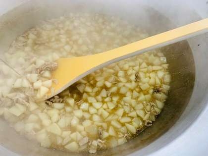 給食室でだいこんの煮ものを作っている様子です。こんぶとけずりぶしでだしをとり、豚肉とだいこんを煮ます。でんぷんでとろみをつけて食べやすくしています。