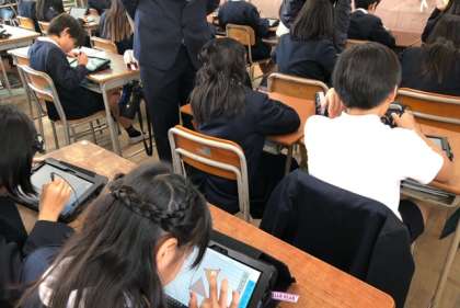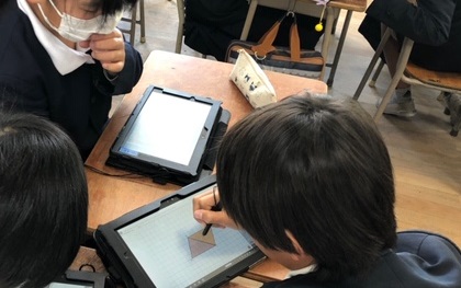 5年生の算数では、三角形の面積の求め方を考えました。タブレットをつかってもとの三角形をコピーしてくっつけたり、切り取って移動させたりして面積を求めました。