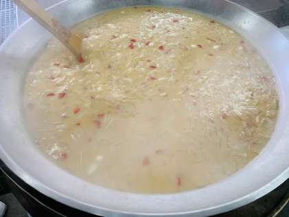 給食室でぞう煮を作っている様子です。正月の行事献立なので、きんときにんじんが使われています。
