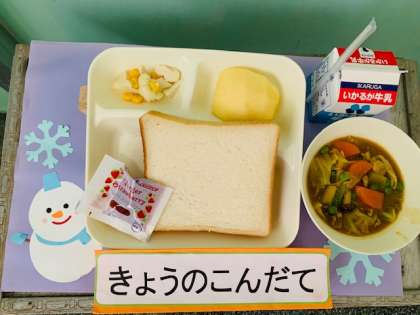 豚肉と野菜のカレー煮、カリフラワーとコーンのサラダ、りんご、食パン、いちごジャム、牛乳