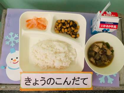 筑前煮、ひじき豆、紅白なます、ごはん、牛乳
