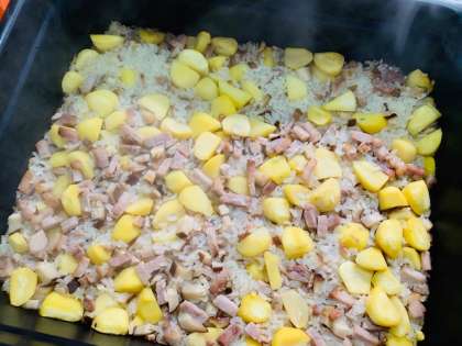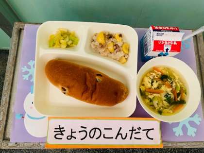中華おこわ、卵スープ、キャベツのオイスターソースいため、レーズンパン、牛乳