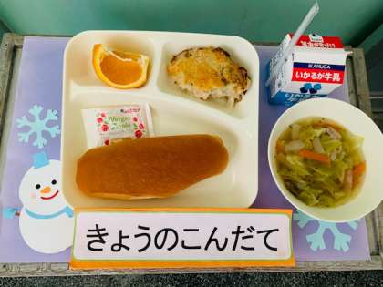 押麦のグラタン、スープ、いよかん、コッペパン、りんごジャム、牛乳
