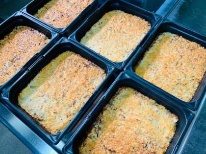 給食室で押麦のグラタンを作っている様子です。押麦は、おもにエネルギーのもとになる食べ物です。おなかの調子を整える「食物せんい」もとても多く含まれています。