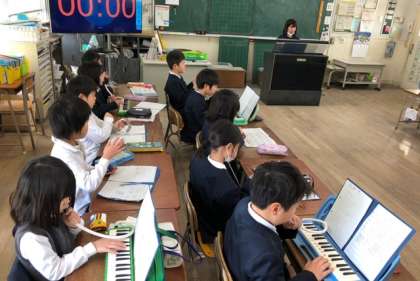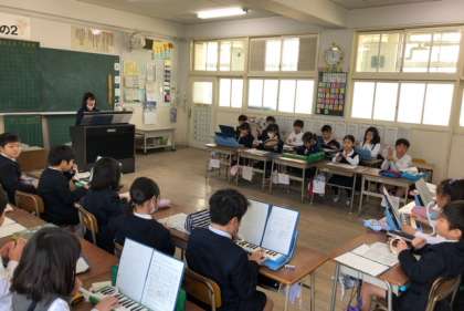 2年生の音楽では、合奏をしています。リズムや音の重なりを意識しながら演奏することができました。