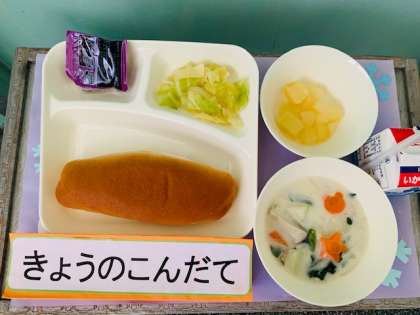 ほうれんそうのクリームシチュー、キャベツのサラダ、洋なし(かんづめ)、コッペパン、ブルーベリージャム