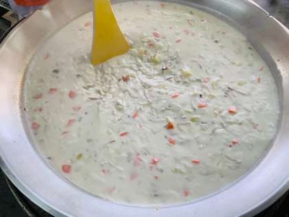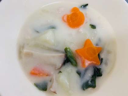 給食室でほうれんそうのクリームシチューを作っている様子です。今日のシチューには、ラッキーにんじんが入っています。