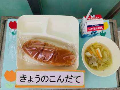 豚肉とキャベツのスープ、おさつパン、牛乳