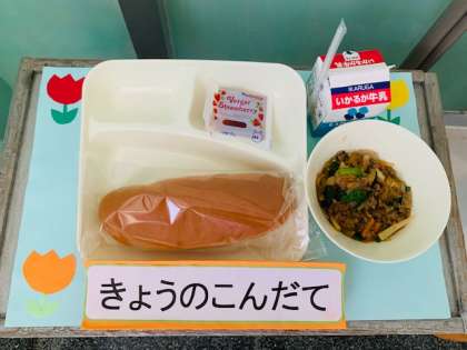 マーボーはるさめ、コッペパン、いちごジャム、牛乳