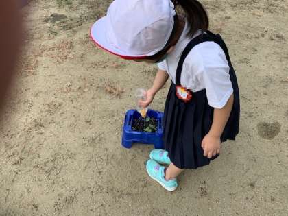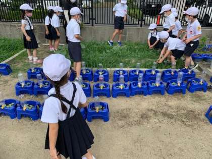 1年生はあさがおを育てています。毎日、一生懸命に水やりをしています。きれいなあさがおが咲くことを楽しみにしています。