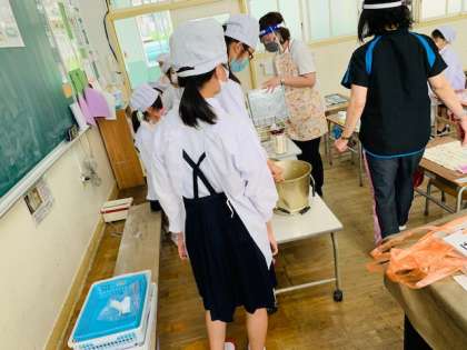 6年生が1年生の給食準備を手伝っています。1年生のお手本になるように、がんばっていました。