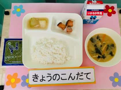 さけのつけ焼き、みそ汁、とうがんの煮もの、手巻きのり、ごはん、牛乳